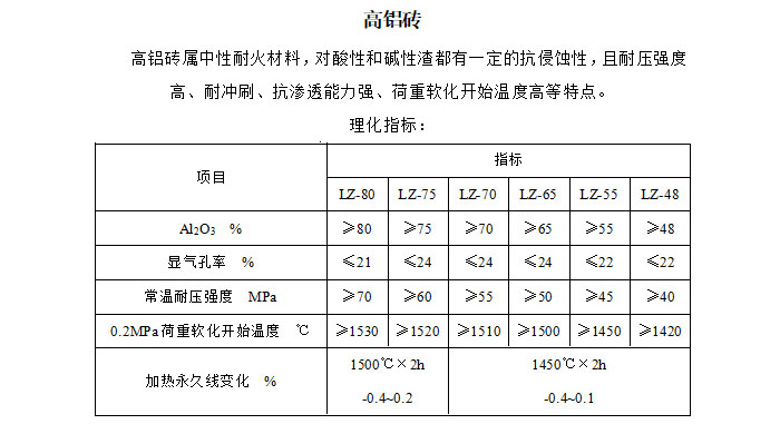 高鋁磚(High-alumina brick):氧化鋁含量在48%以上的一種中性耐火材料。由礬土或其他氧化鋁含量較高的原料經成型和煅燒而成。熱穩定性高,耐火度比粘土磚高。抗渣性較好,用于砌筑煉鋼電爐、玻璃熔爐、水泥回轉窯、鍋爐等窯爐的襯里。